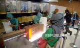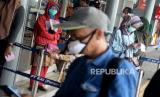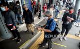 Sejumlah calon penumpang antre untuk melakukan pembatalan tiket kereta di Stasiun Pasar Senen, Jakarta, Kamis (23/4). Terkait dengan larangan mudik 2020, PT Kereta Api Indonesia melayani pembatalan tiket kereta dengan pengembalian dana 100 persen bagi penumpang, pembatalan dapat dilakukan hingga 30 April 2020 (FOTO : Prayogi/Republika)