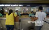 Petugas melayani calon penumpang yang melakukan pembatalan tiket kereta di Stasiun Pasar Senen, Jakarta, Kamis (23/4). Terkait dengan larangan mudik 2020, PT Kereta Api Indonesia melayani pembatalan tiket kereta dengan pengembalian dana 100 persen bagi penumpang, pembatalan dapat dilakukan hingga 30 April 2020 (FOTO : Prayogi/Republika)
