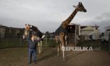 Davio Casartelli, pelatih gajah dan jerapah berusia 64 tahun memperlihatkan jerapahnya Piccola (kiri) dan Lamia (kanan) di Sirkuit Romina Orfei, yang diparkir di San Nicola la Strada, dekat Naples, Italia, Minggu (19/4). irkus keliling Rony Roller membuat penampilan terakhir pada 1 Maret 2020 lalu sebagai acara sirkus penutupan sebelum masa lockdown nasional di Italia sebagai upaya pencegahan penyebaran virus COVID-19 serta telah mengistirahatkan sebanyak 60 hewan sirkus dan tujuh anggota sirkus akibat COVID-19 (FOTO : AP)