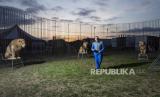 Rony Vassallo berpose untuk potret dengan singa di sirkus Rony Roller, diparkir di pinggiran Roma, Sabtu, (18/4). Sirkus keliling Rony Roller membuat penampilan terakhir pada 7 Maret 2020 lalu sebagai acara sirkus penutupan sebelum masa lockdown nasional di Italia sebagai upaya pencegahan penyebaran virus COVID-19 serta telah mengistirahatkan sebanyak 60 hewan sirkus dan tujuh anggota sirkus akibat COVID-19 (FOTO : AP)