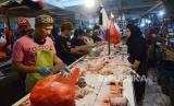 REPUBLIKA.CO.ID, BANDUNG -- Pedagang ayam melayani pembeli kios daging ayam di Pasar Panorama, Kecamatan Lembang Kabupaten Bandung Barat, Kamis (23/4).