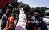 Sejumlah penumpang bus diperiksa suhu tubuhnya usai turun dari bus saat penerapan Pembatasan Sosial Berskala Besar (PSBB) di Terminal Leuwipanjang, Kota Bandung, Kamis (23/4). Seluruh penumpang beserta awak bus yang turun di terminal Leuwipanjang khususnya yang berasal dari zona merah Covid-19 wajib menjalani pemeriksaan suhu tubuh, penyemprotan disinfektan dan Rapid Test Covid-19 guna memastikan kesehatannya dan mengantisipasi penyebaran Covid-19 (FOTO : ABDAN SYAKURA/REPUBLIKA)