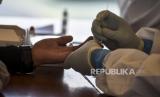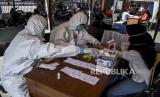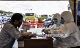 Petugas kesehatan mengambil sampel darah penumpang bus saat Rapid Test Covid-19 di Terminal Leuwipanjang, Kota Bandung, Kamis (23/4). Seluruh penumpang beserta awak bus yang turun di terminal Leuwipanjang khususnya yang berasal dari zona merah Covid-19 wajib menjalani pemeriksaan suhu tubuh, penyemprotan disinfektan dan Rapid Test Covid-19 guna memastikan kesehatannya dan mengantisipasi penyebaran Covid-19 (FOTO : ABDAN SYAKURA/REPUBLIKA)