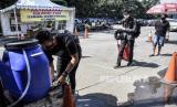 Sejumlah penumpang bus mencuci tangannya usai turun dari bus saat penerapan Pembatasan Sosial Berskala Besar (PSBB) di Terminal Leuwipanjang, Kota Bandung, Kamis (23/4). Seluruh penumpang beserta awak bus yang turun di terminal Leuwipanjang khususnya yang berasal dari zona merah Covid-19 wajib menjalani pemeriksaan suhu tubuh, penyemprotan disinfektan dan Rapid Test Covid-19 guna memastikan kesehatannya dan mengantisipasi penyebaran Covid-19 (FOTO : ABDAN SYAKURA/REPUBLIKA)