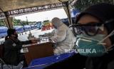 Sejumlah penumpang bus menjalani Rapid Test Covid-19 saat penerapan Pembatasan Sosial Berskala Besar (PSBB) di Terminal Leuwipanjang, Kota Bandung, Kamis (23/4). Seluruh penumpang beserta awak bus yang turun di terminal Leuwipanjang khususnya yang berasal dari zona merah Covid-19 wajib menjalani pemeriksaan suhu tubuh, penyemprotan disinfektan dan Rapid Test Covid-19 guna memastikan kesehatannya dan mengantisipasi penyebaran Covid-19 (FOTO : ABDAN SYAKURA/REPUBLIKA)