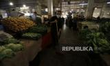 Seorang berjalan menyusuri pasar makanan sementara seorang pedagang mengenakan masker saat menata sayuran di Aljazair, Selasa (21/4). Warga Aljazair berbelanja untuk mempersiapkan bulan suci Ramadhan yang dimulai Kamis di Aljazair. Umat Muslim di seluruh dunia berusaha untuk mempertahankan ritual Islam yang paling dihargai pada bulan paling suci tanpa menyebarkan wabah virus Corona. ( (FOTO : AP / Toufik Doudou)