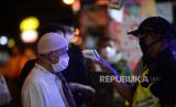 Petugas memeriksa suhu tubuh jamaah ibadah tarawih pertama Ramadhan 1441 Hijriyah di Masjid Jogokariyan, Yogyakarta, Kamis (23/4). Ibadah tarawih di Masjid Jogokariyan dilaksanakan khidmat dan ketat di tengah pandemi virus corona (FOTO : Wihdan Hidayat/ Republika)