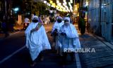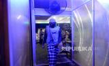 Jamaah melewati box disinfektan sebelum ibadah tarawih pertama Ramadhan 1441 Hijriyah di Masjid Jogokariyan, Yogyakarta, Kamis (23/4). Ibadah tarawih di Masjid Jogokariyan dilaksanakan khidmat dan ketat di tengah pandemi virus corona (FOTO : Wihdan Hidayat/ Republika)
