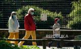 Pengunjung menggunakan masker berjalan di area kebun binatang di Landau, Jerman, Rabu (22/4). Sejak 20 April 2020 kebun binatang di negara bagian Rhineland-Palatinate diizinkan untuk kembali dibuka di bawah aturan keamanan yang ketat untuk memperlambat pandemi penyakit COVID-19 yang sedang berlangsung (FOTO : EPA-EFE/RONALD WITTEK)