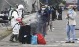Petugas kesehatan menyemprotkan cairan disinfektan ke barang milik Warga Negara Indonesia (WNI) yang menjadi anak buah kapal Kapal Pesiar MV Arthania setibanya di Pelabuhan JICT, Tanjung Priok, Jakarta, Jumat (24/4). Sebanyak 56 WNI tersebut akan dibawa menuju RS Darurat COVID-19 Wisma Atlet Kemayoran untuk diobservasi. (FOTO : ANTARA/Muhammad Adimaja)
