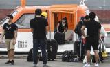 Warga Negara Indonesia (WNI) yang menjadi anak buah kapal Kapal Pesiar MV Arthania tiba di Pelabuhan JICT, Tanjung Priok, Jakarta, Jumat (24/4). Sebanyak 56 WNI tersebut akan dibawa menuju RS Darurat COVID-19 Wisma Atlet Kemayoran untuk diobservasi. (FOTO : ANTARA/Muhammad Adimaja)