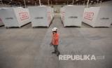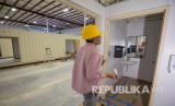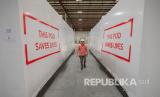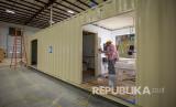REPUBLIKA.CO.ID, LAWRENCEVILLE -- Manajer proyek BMarko Structures, Mateo Atwi berjalan melewati kontainer yang diubah menjadi kamar rumah sakit portabel untuk merawat pasien COVID-19, di Lawrenceville, Georgia, Amerika Serikat, Jumat (23/4).