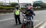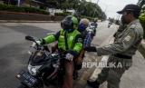 Petugas Satpol PP menghimbau pengendara motor yang berasal dari luar kota saat penerapan pelarangan mudik di Jalur Pantura, Perbatasan Kabupaten Bekasi dengan Karawang, Kabupaten Bekasi, Jawa Barat, Sabtu (25/4). Hari kedua penerapan pelarangan mudik di jalur pantura masih banyak pengendara yang memaksakan untuk mudik dan tidak menerapkan jarak sosial (FOTO : Republika/Putra M. Akbar)