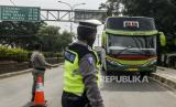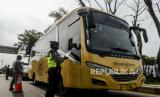 Polisi menghentikan bus saat penerapan pelarangan mudik di Jalur Pantura, Perbatasan Kabupaten Bekasi dengan Karawang, Kabupaten Bekasi, Jawa Barat, Sabtu (25/4). Hari kedua penerapan pelarangan mudik di jalur pantura masih banyak pengendara yang memaksakan untuk mudik dan tidak menerapkan jarak sosial (FOTO : Republika/Putra M. Akbar)