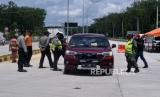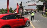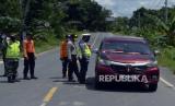 Polisi melarang masuk mobil berplat nomor luar daerah menuju Kediri yang dicurigai akan mudik di Kediri, Jawa Timur, Ahad (26/4/2020). Pemeriksaan (check point) di akses utama masuk Kediri tersebut terkait larangan mudik guna menangkal penyebaran COVID-19 (FOTO : ANTARA/Prasetia Fauzani/)