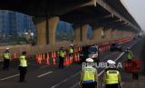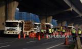 Petugas gabungan mengarahkan kendaraan untuk keluar Tol Cikarang Barat, di ruas Tol Cikampek, Jabar,Ahad (26/042020). Larangan mudik dan sosialisasi aturan Pembatasan Sosial Berskala Besar (PSBB) di ruas tol itu guna mencegah penyebaran COVID-19 dengan membatasi kendaraan pribadi dan angkutan umum yang melintas (FOTO : ANTARA/Saptono)