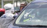 Polisi memeriksa suhu tubuh dan KTP pengendara mobil berplat nomor luar daerah di Mengkreng, Kediri, Jawa Timur, Ahad (26/4/2020). Pemeriksaan (check point) di akses utama masuk Kediri tersebut terkait larangan mudik guna menangkal penyebaran COVID-19 (FOTO : ANTARA/Prasetia Fauzani)
