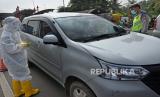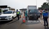 REPUBLIKA.CO.ID, SERANG -- Personel gabungan Dishub, TNI, Polri serta petugas medis memeriksa pengendara keluar di pintu tol Serang Timur, di Serang, Banten, Senin (27/4/2020).