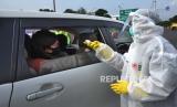 Petugas medis didampingi anggota TNI-Polri memeriksa suhu tubuh penumpang mobil yang baru keluar di pintu tol Serang Timur, di Serang, Banten, Senin (27/4/2020). Pengawasan dan penyekatan mobilitas di pintu masuk menuju Kota Serang dan Wilayah Banten Selatan itu dilakukan untuk mencegah gelombang arus mudik lebaran di tengah pandemi COVID-19 (FOTO : ANTARA/ASEP FATHULRAHMAN)