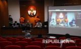 Wakil Ketua KPK Alexander Marwata (keempat kiri) didampingi Deputi Penindakan Brigjen Pol Karyoto (kedua kiri) dan Jubir KPK Ali Fikri (kanan) menghadirkan kedua tersangka baru hasil pengembangan kasus dugaan suap proyek-proyek di Dinas PUPR Kabupaten Muara Enim Aries HB (kedua kanan) dan Ramlan Suryadi (ketiga kiri) dalam konferensi pers di Gedung KPK, Jakarta, Senin (27/4/2020). KPK menahan Ketua DPRD Kabupaten Muara Enim Aries HB dan Plt Kepala Dinas PUPR Kabupaten Muara Enim Ramlan Suryadi dalam pengembangan kasus dugaan suap proyek-proyek di Dinas PUPR Kabupaten Muara Enim tahun 2019 yang menjerat Bupati Muara Enim Ahmad Yani dalam Operasi Tangkap Tangan (OTT) dengan barang bukti 35 ribu dollar AS pada 3 September 2019 lalu. (FOTO : Antara/Indrianto Eko Suwarso)