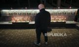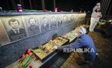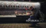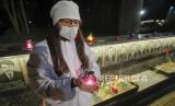 Warga Ukraina menyalakan lilin dan melatakan bunga di monumen peringatan yang meninggal selama pembersihan setelah bencana pembangkit listrik tenaga nuklir Chernobyl ketika upacara di kota Slavutich, sekitar 190 km utara ibukota Kiev, Ukraina, Ahad (26/4). (FOTO : EPA-EFE/SERGEY DOLZHENKO)
