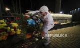 Seorang pria berpakaian kostum pekerja pabrik nuklir meletakkan bunga di monumen peringatan yang meninggal selama pembersihan setelah bencana pembangkit listrik tenaga nuklir Chernobyl ketika upacara di kota Slavutich, sekitar 190 km utara ibukota Kiev, Ukraina, Ahad (26/4). (FOTO : EPA-EFE/SERGEY DOLZHENKO)