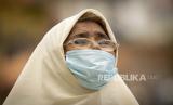 Seorang wanita Muslim mengenakan masker untuk membantu mencegah penyebaran virus corona di dekat area lockdown Selayang Baru, di luar Kuala Lumpur, Malaysia, Ahad (26/4). Lockdown tersebut dilakukan untuk memungkinkan aparat berwenang dalam melakukan penyaringan dan membantu mencegah penyebaran coronavirus (FOTO : AP / Vincent Thian )