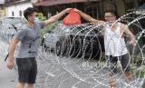 Seorang lelaki memberikan persediaan makanan melalui kawat berduri di area lockdown Selayang Baru, di luar Kuala Lumpur, Malaysia, Ahad (26/4). Lockdown tersebut dilakukan untuk memungkinkan aparat berwenang dalam melakukan penyaringan dan membantu mencegah penyebaran coronavirus (FOTO : AP / Vincent Thian )