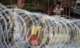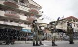 Prajurit tentara Malaysia berjaga didekat kawat berduri di area lockdown Selayang Baru, di luar Kuala Lumpur, Malaysia, Ahad (26/4). Lockdown tersebut dilakukan untuk memungkinkan aparat berwenang dalam melakukan penyaringan dan membantu mencegah penyebaran coronavirus (FOTO : AP / Vincent Thian )