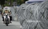 Pengendara sepeda motor berjalan sepanjang pagar kawat berduri di area lockdown Selayang Baru, di luar Kuala Lumpur, Malaysia, Ahad (26/4). Lockdown tersebut dilakukan untuk memungkinkan aparat berwenang dalam melakukan penyaringan dan membantu mencegah penyebaran coronavirus (FOTO : AP / Vincent Thian )