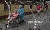 Seorang petugas kesehatan mendorong seorang kakek yang berada kursi roda di sebelah kawat berduri di area lockdown Selayang Baru, di luar Kuala Lumpur, Malaysia, Ahad (26/4). Lockdown tersebut dilakukan untuk memungkinkan aparat berwenang dalam melakukan penyaringan dan membantu mencegah penyebaran coronavirus (FOTO : AP / Vincent Thian )