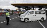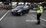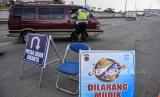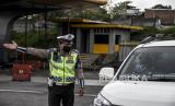 Petugas kepolisian mengatur lalu lintas di pos pemeriksaan Pembatasan Sosial Berskala Besar (PSBB) di Gerbang Tol Cileunyi, Kabupaten Bandung, Selasa (28/4). Penindakan berupa pemeriksaan surat kendaraan, surat tugas serta mengarahkan kendaraan untuk memutar balik tersebut merupakan tidak lanjut kebijakan larangan penggunaan kendaraan umum dan kendaraan bermotor pribadi untuk mudik (FOTO : ABDAN SYAKURA/REPUBLIKA)
