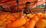 Pedagang menata buah timun suri di Pasar Induk Kramat Jati, Jakarta, Selasa (28/4). Menurut sejumlah pedagang setempat, permintaan buah musiman tersebut pada Ramadhan tahun ini menurun sekitar 50 persen dibandingkan Ramadhan 2019 karena dipicu penerapan pembatasan sosial berskala besar (PSBB) dan menurunnya daya beli masyakarat selama pandemi COVID-19. (FOTO : ANTARA/Aditya Pradana Putra)