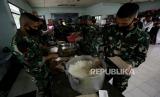 Prajurit TNI AD membungkus nasi untuk dibagikan kepada warga di dapur umum PSBB Jatim di Makodam V/Brawijaya, Surabaya, Jawa Timur, Selasa (28/4/2020). Dapur umum tersebut menyediakan kebutuhan makanan bagi masyarakat yang terdampak COVID-19 pada masa Pembatasan Sosial Berskala Besar (PSBB) di tiga wilayah yakni Kota Surabaya, Kabupaten Sidoarjo, dan Gresik (FOTO : Antara/Moch Asim)