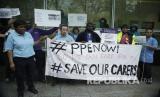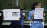 REPUBLIKA.CO.ID, LONDON -- Sejumlah pekerja rumah sakit menggelar aksi yang meminta pemerintah Inggris untuk menyediakan Alat Pelindung Diri (APD) di seluruh Inggris untuk semua tenaga medis, London, Selasa (28/4).
