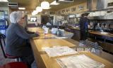 Kim Kaseta menunggu patty mencair saat duduk di konter Waffle House, Brookhaven, Georgia, AS, Senin (27/4). Beberapa restoran Georgia dibuka kembali untuk layanan makan terbatas (FOTO : Steve Schaefer / Atlanta Journal - Constituti)