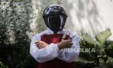 Tukang cukur rambut menggunakan alat pelindung diri (APD) berpose usai mencukur rambut di rumah pelanggannya di kawasan Kelapa Dua, Depok, Jawa Barat, Rabu (29/4). Jasa cukur panggilan dengan menggunakan APD menjadi alternatif pelaku usaha pangkas rambut untuk bertahan ditengah pandemi COVID-19 serta sebagai upaya memutus mata rantai COVID-19 (FOTO : Republika/Thoudy Badai)