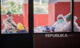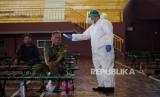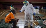 Petugas medis melakukan pengecekan suhu tubuh kepada penyandang masalah kesejahteraan sosial (PMKS) di Gelanggang Olahraga (GOR) Ciracas yang dijadikan tempat penampungan sementara, Jakarta Timur, Rabu (29/4). Pemerintah Provinsi DKI Jakarta menyiapkan seluruh GOR di Jakarta sebagai tempat penampungan PMKS yang terjaring setelah dilakukan rapid test COVID-19 sebagai upaya mengantisipasi penyebaran COVID-19 (FOTO : Republika/Thoudy Badai)