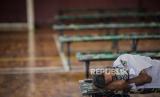 Penyandang masalah kesejahteraan sosial (PMKS) tertidur di Gelanggang Olahraga (GOR) Ciracas yang dijadikan tempat penampungan sementara di Ciracas, Jakarta Timur, Rabu (29/4). Pemerintah Provinsi DKI Jakarta menyiapkan seluruh GOR di Jakarta sebagai tempat penampungan PMKS yang terjaring setelah dilakukan rapid test COVID-19 sebagai upaya mengantisipasi penyebaran COVID-19 (FOTO : Republika/Thoudy Badai)