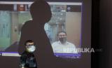 REPUBLIKA.CO.ID, JAKARTA -- Seorang pria melintasi layar yang menayangkan sidang vonis dengan terdakwa bekas Anggota DPR Fraksi PAN Sukiman, via Video Conference antara Pengaadilan Tipikor dan Gedung KPK C1, Jakarta, Rabu (29/4/2020).