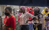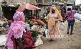 Mame Sey, istri Bara Tambedou (tengah) mengenakan masker saat ia pergi ke pasar untuk membeli makanan pada hari pertama Ramadhan di Dakar, Senegal, Sabtu (25/4). Tahun ini keluarga Bara Tambedou merayakan Ramadhan di rumah (FOTO : AP)