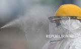 Petugas dari Kantor Kesehatan Pelabuhan (KKP) Kelas I Tanjung Priok menyemprotkan cairan disinfektan ke kepala rekannya usai melaksanakan rapid test atau pemeriksaan cepat COVID-19 terhadap Warga Negara Indonesia (WNI) yang menjadi anak buah kapal Pesiar MV Carnival Splendor saat tiba di Pelabuhan JICT, Tanjung Priok, Jakarta, Kamis (30/4/2020). Sebelum dibawa menuju hotel untuk dilakukan isolasi mandiri selama satu minggu, 375 WNI tersebut terlebih dahulu menjalani rapid test (FOTO : ANTARA /NOVA WAHYUDI)