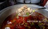 Relawan memasak kari ayam dan rebung di Masjid Bang Aw, Bangkok, Thailand, Kamis (30/4). Selama Ramadhan, sukarelawan Masjid Bang Aw memasak makanan untuk 150 keluarga di lingkungan itu setiap hari (FOTO : AP / Gemunu Amarasinghe)