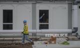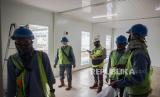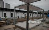 REPUBLIKA.CO.ID, JAKARTA -- Pekerja beraktivitas di area proyek pembangunan rumah sakit darurat COVID-19 milik Pertamina di kompleks Universitas Pertamina, Jakarta, Sabtu (2/5).