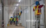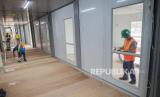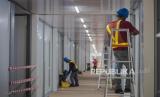 Pekerja menyelesaikan proyek pembangunan rumah sakit darurat COVID-19 milik Pertamina di kompleks Universitas Pertamina, Jakarta, Sabtu (2/5). Pertamina mendirikan rumah sakit darurat COVID-19 di lapangan bola Simprug dengan luas sekitar 22 (FOTO : Republika/Thoudy Badai)
