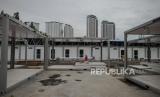 Pekerja beraktivitas di area proyek pembangunan rumah sakit darurat COVID-19 milik Pertamina di kompleks Universitas Pertamina, Jakarta, Sabtu (2/5). Pertamina mendirikan rumah sakit darurat COVID-19 di lapangan bola Simprug dengan luas sekitar 22 (FOTO : Republika/Thoudy Badai)