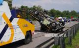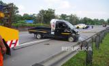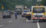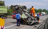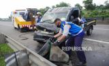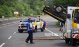REPUBLIKA.CO.ID, PURWAKARTA -- Sebuah mobil pickup terguling di Tol Cipularang KM 77 arah Jakarta, Ahad (3/5). Kecelakaan tunggal tersebut menyebabkan pickup terlentang dengan posisi keempat ban di atas. Sopir dilarikan menuju RS MH Thamrin Purwakarta.