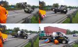 Di pagar bahu jalan tol tampak bekas tabrakan mobil tersebut sebelum akhirnya terguling. Petugas Jasa Marga mengevakuasi pickup tersebut di antara jalan yang tidak begitu ramai.