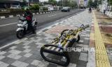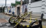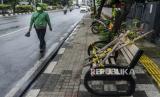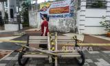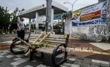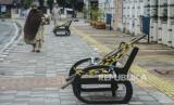 Petugas Dishub melintas di dekat bangku trotar yang disegel garis pembatas dan ditutupi bambu di kawasan Rawamangung, Jakarta, Senin (4/5). Bangku trotoar di sepanjang jalan Rawamangun disegel untuk mencegah kerumunan warga untuk mengantisipasi penyebaran virus Corona (FOTO : Republika/Putra M. Akbar)