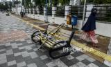 Warga melintas di dekat bangku trotar yang disegel garis pembatas dan ditutupi bambu di kawasan Rawamangun, Jakarta, Senin (4/5). Bangku trotoar di sepanjang jalan Rawamangun disegel untuk mencegah kerumunan warga untuk mengantisipasi penyebaran virus Corona (FOTO : Republika/Putra M. Akbar)